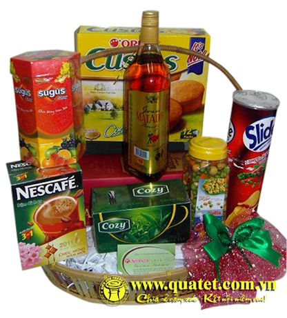 | CHI TIẾT SẢN PHẨM _ Rượu Brand Matador Solera 700ml _ Bánh Custas Orion cao cấp 276g _ Kẹo mềm cao cấp Sugus 200g _ Cà Phê hòa tan Nescafe đậm đà 3 trong 1 hộp 20 gói * 17g _ Trà xanh Cosy 50g _ Khoai tây chiên Slide Kinh Đô 160g _ Đậu Funmix Tân Tân hũ 230g _ Giỏ thủ công đựng quà _ Giấy bóng kính và nơ cao cấp. * Chú ý: Tất cả các sản phẩm của Công ty Điện hoa Thăng Long đều được ghi rõ nhãn hàng thương hiệu của nhà sản xuất, công ty nhập khẩu và hạn sử dụng trên từng sản phẩm. Quý khách hàng và Công ty đặt hàng số lượng trên 500 sản phẩm liện hệ sớm tới bộ phận kinh doanh của chúng tôi để được tư vấn và cung cấp.